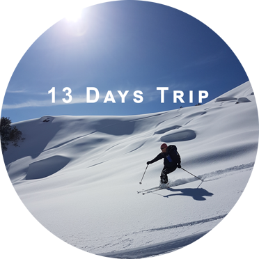 - Skis : wide powder skis minimum 100mm width, mounted with touring bindings, adjustable poles, skins and snow knives.